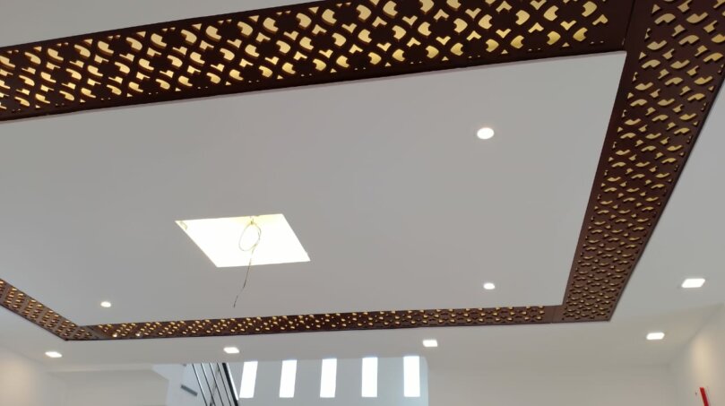 One of the main attractions of this elegant Brand New House for Sale in Mannuthy is its interiors. The ceiling works are well-designed and decorated with charming lighting and false ceiling materials. That gives a classy look to the whole house. The entire house is designed with a combination of white and wooden shades.